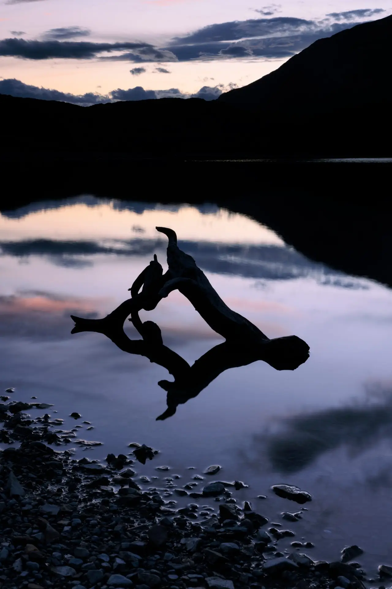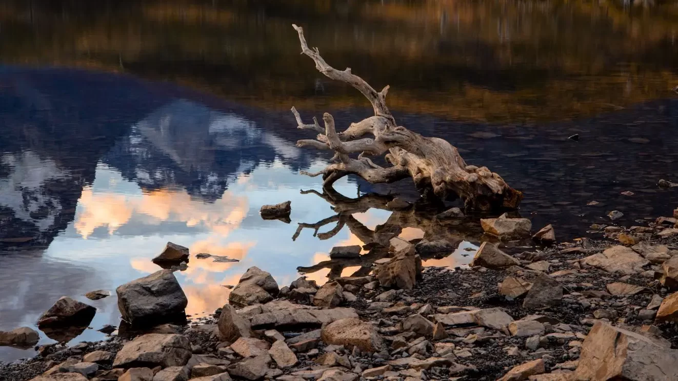 Fragmentos que talvez passassem despercebidos: uma madeira repousando na beira da água, um galho marcado por muitas estações, um tronco solitário fincado no azul.